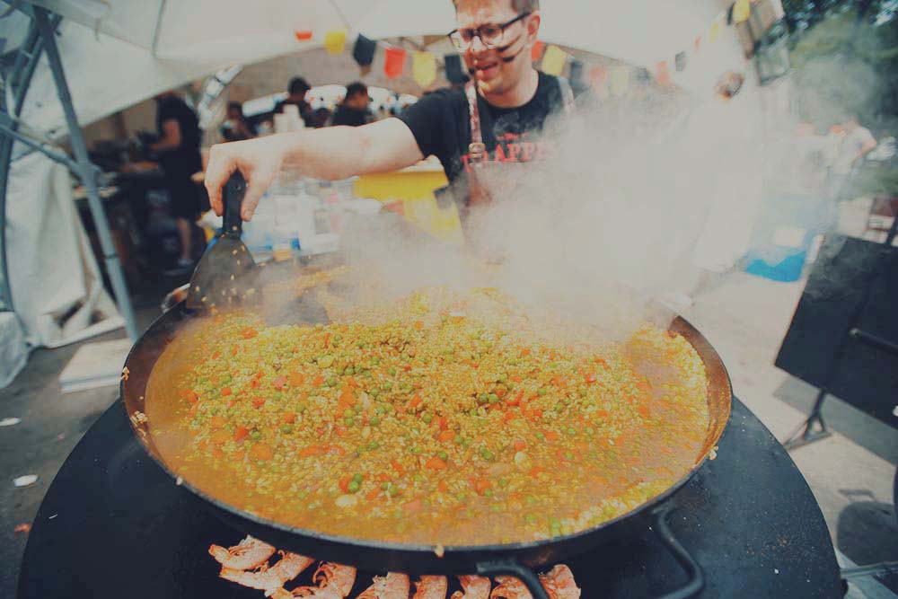 The Spanish approach to a meal for a large company: a huge bowl, seafood, rice, vegetables, spices and lots of fire!